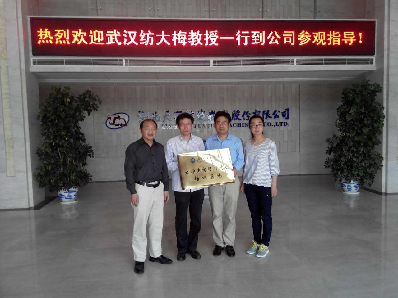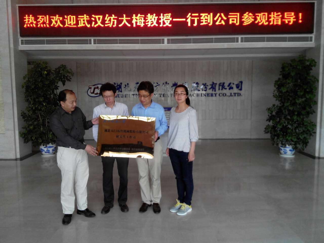 武汉纺织大学携手太阳成城集团建立湖北省研究生工作站和大学生实习与就业基地(从左至右依次为院长梅顺齐、执行院长燕怒、总工程师郑强、办公室主任李静)