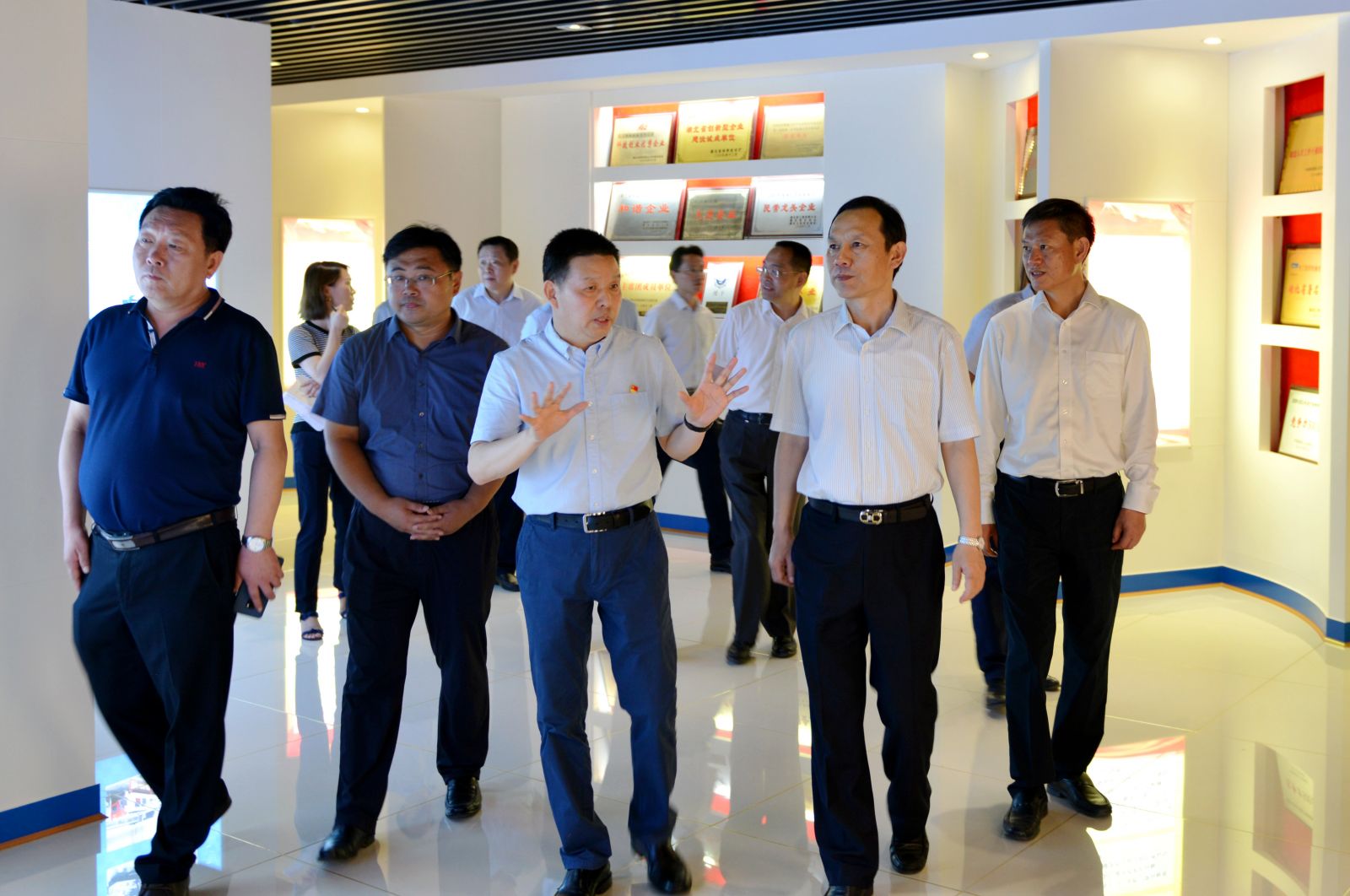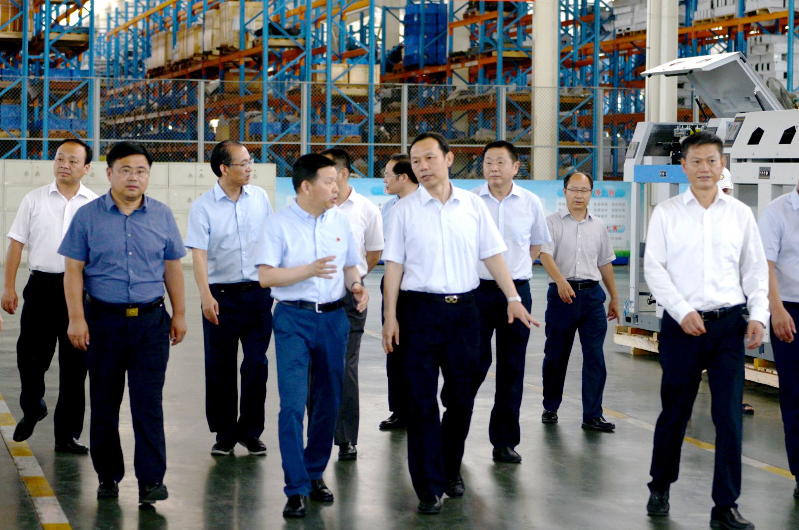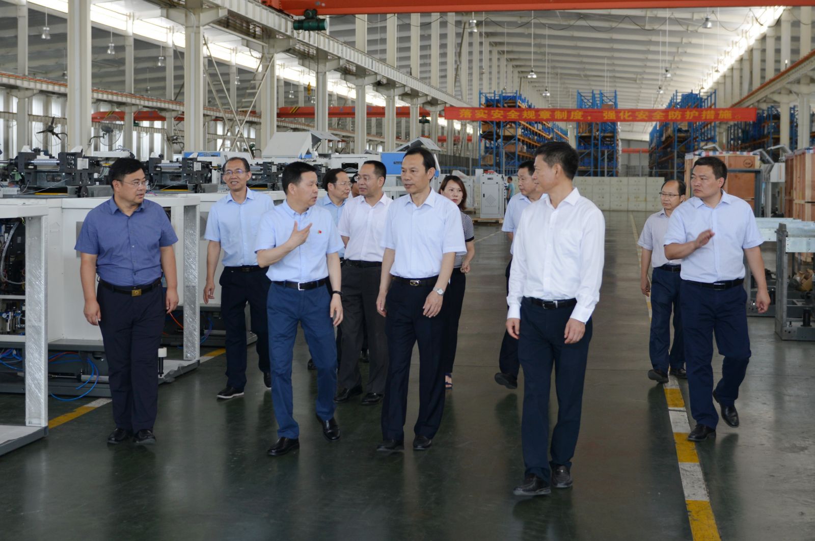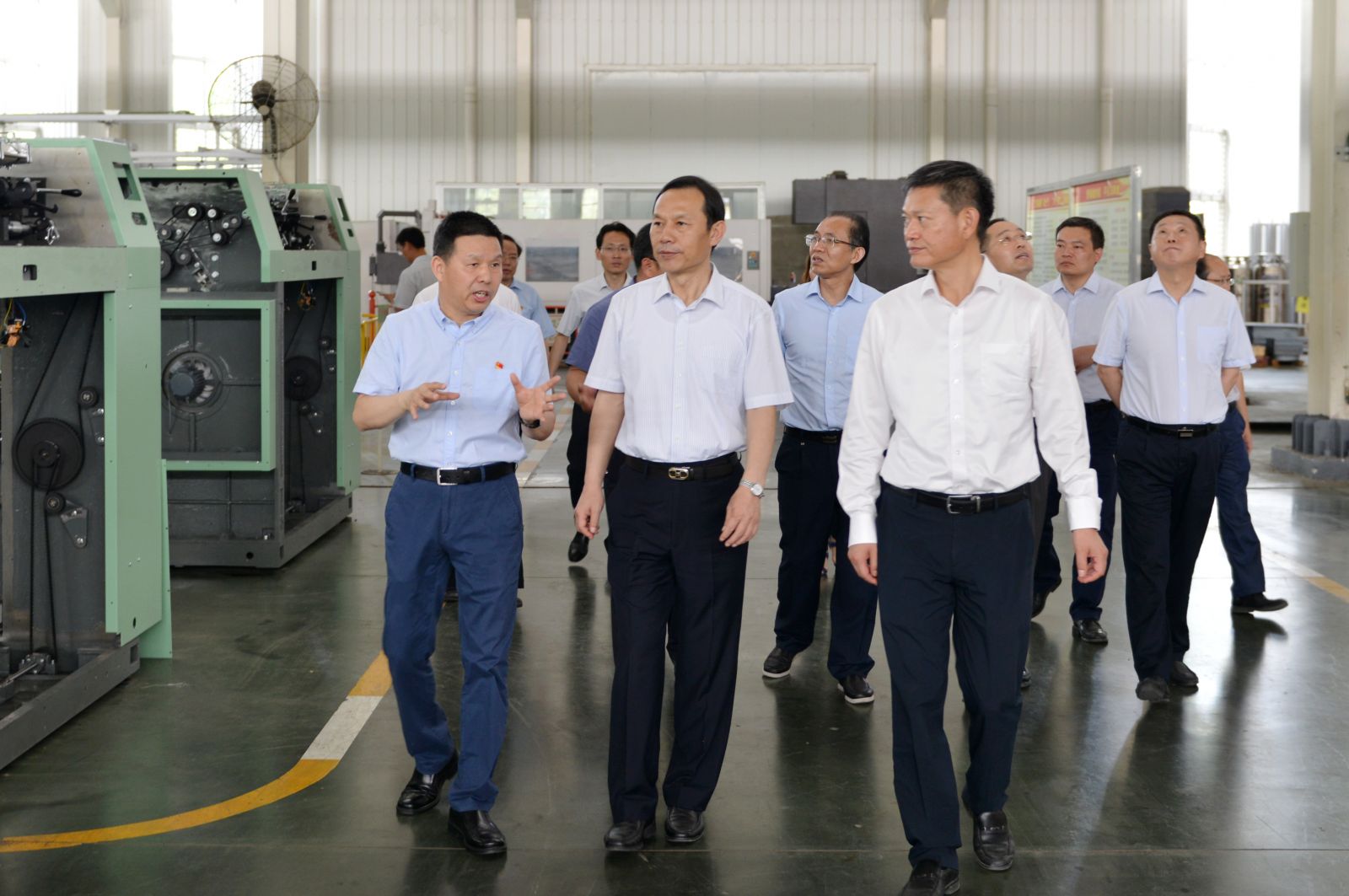 2019年7月16日上午,湖北省委副书记、武汉市委书记马国强在天门市委书记庄光明的陪同下,考察了太阳成城集团。公司董事长沈方勇引导马书记一行参观了生产现场和综合展示厅,并向马书记介绍了企业基本情况。沈方勇说:太阳成城集团是一家老字号机械制造企业,通过改革、改制、改造,成为国内集研发、生产、销售于一体的纺织装备重要供应商和中国纺织机械协会副会长单位,主导产品棉纺并条机在国内无论生产规模还是产销量均处于领先地位。虽然今年以来中美贸易摩擦给行业带来了许多不利影响,但目前公司生产经营运行正常,新产品研发后劲十足,下一个赶超的目标是代表世界先进水平的瑞士立达和德国特吕茨勒的同类产品,力争打造国际品牌,实现可持续发展。马书记听到汇报后表示赞赏,希望太阳成城集团今后在产品技术上不断创新,在品牌培育上继续发力,在生产经营上进一步做大做强,为民族工业争气争光。