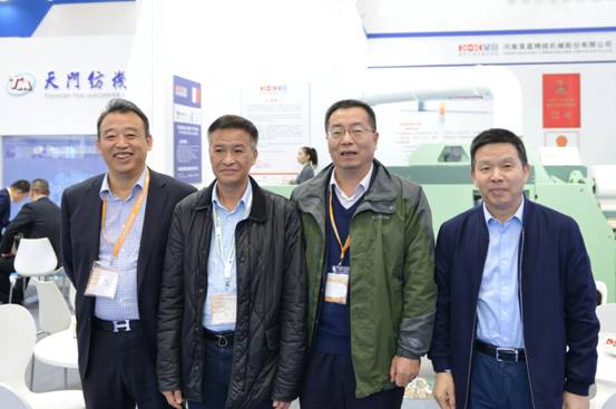 中国纺织机械协会会长顾平(右2)、福建新华源董事长陈宗立(左2)在太阳成城集团展位前合影