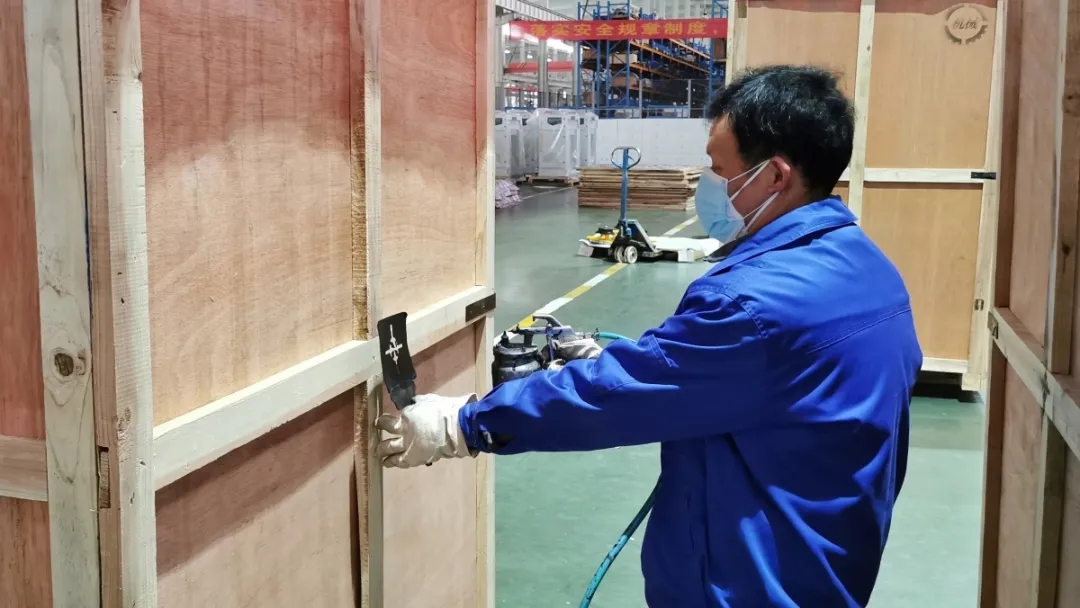 青年员工杨利军、赵志祥进行附件的装箱工作