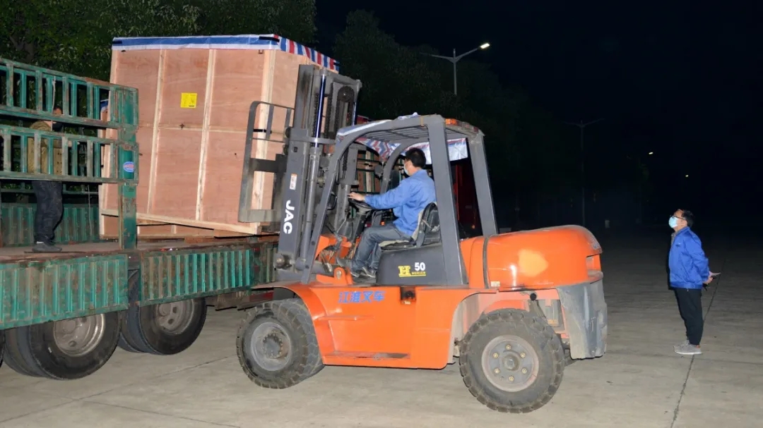 夜幕降临,公司叉车司机姚顺华抓紧时间将包装好的产品进行装车作业