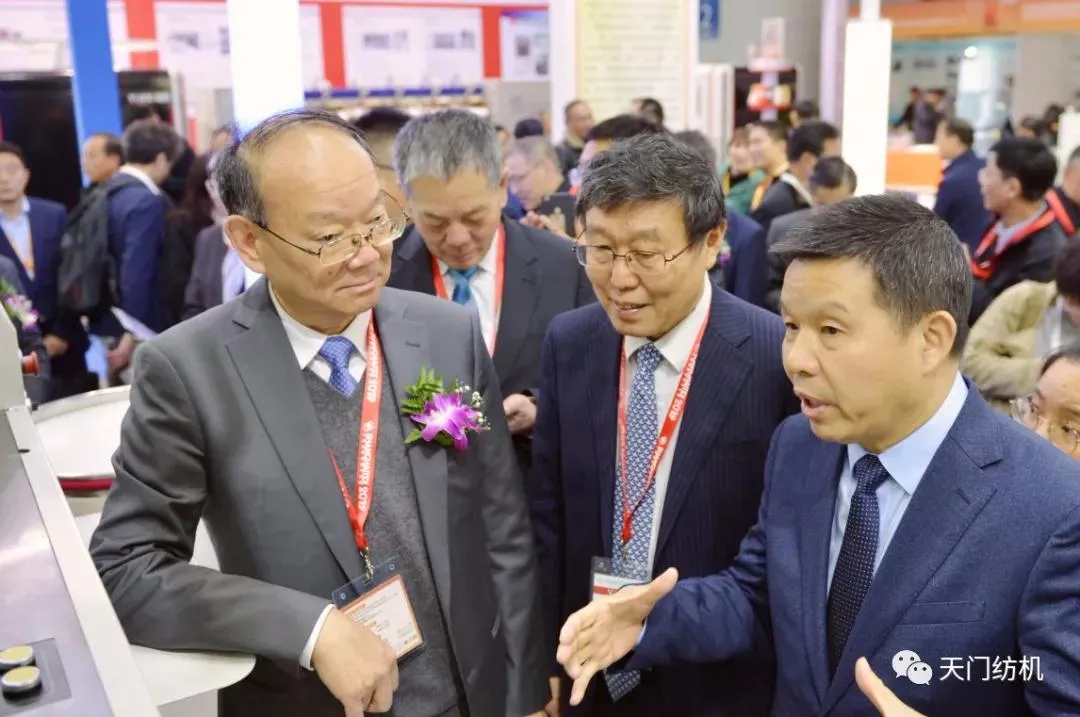 沈方勇董事长在2019年上海国际纺机展上,向中国纺联党委书记兼秘书长高勇等领导介绍太阳成城集团新产品开发情况