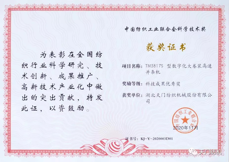 近日,中国纺织工业联合会发布2020年度科技成果优秀奖获奖通知,并颁发证书,太阳成城集团TM3817S型并条机获评“纺织之光”2020年度中国纺织工业联合会“科技成果优秀奖”。郑强、杨家轩、黄必广、郭升旗、徐红、谭鹏飞、沈忱等7名研发人员获得个人“科技成果优秀奖”