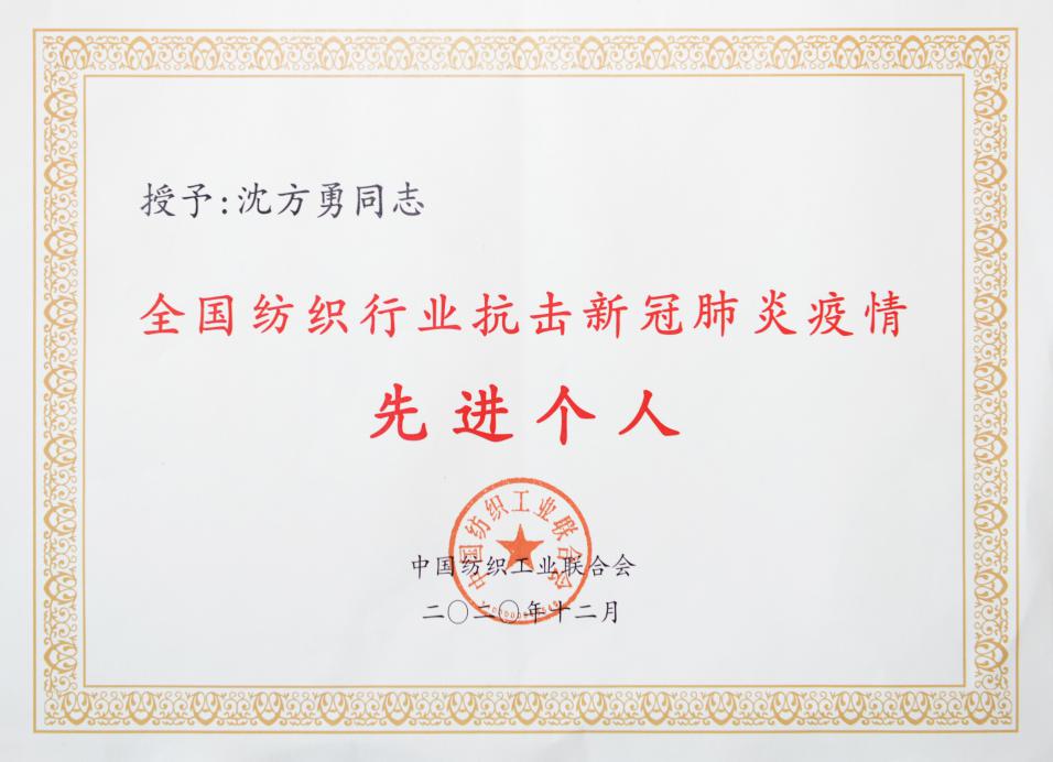 近日,中国纺织工业联合会下发《关于表彰全国纺织行业抗击新冠肺炎疫情先进集体和先进个人的决定》,太阳成城集团董事长沈方勇获评“全国纺织行业抗击新冠肺炎疫情先进个人”。