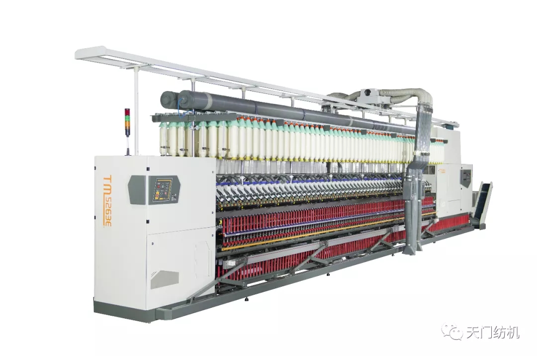 TM5263E型细纱机超长锭数,实纺锭速可达22000转;整体机架,新型纺纱断面;可实现电子牵绅、电子升降、电子加捻、集体落纱;双头吸风,直联永磁电机,使整机节能20%以上,配有单锭检测,粗纱自停装置;配套零尾纱锭子;可实现粗细络联,机台可联网控制和物联网。
