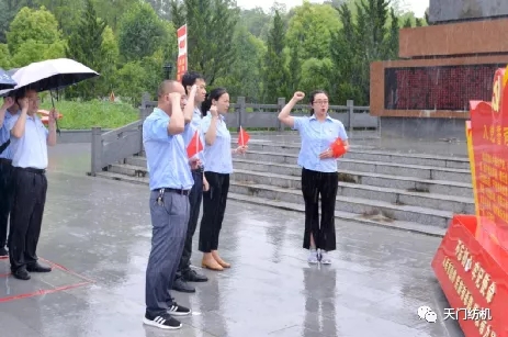 上午11点,风雨交加,全体党员顶风冒雨,整装列队,向湘鄂西苏区瞿家湾革命烈士纪念碑鞠躬默哀。新老党员齐举右手,面向党旗庄严宣誓:“我志愿加入中国共产党……”铮铮誓言彰显了永恒初心。
