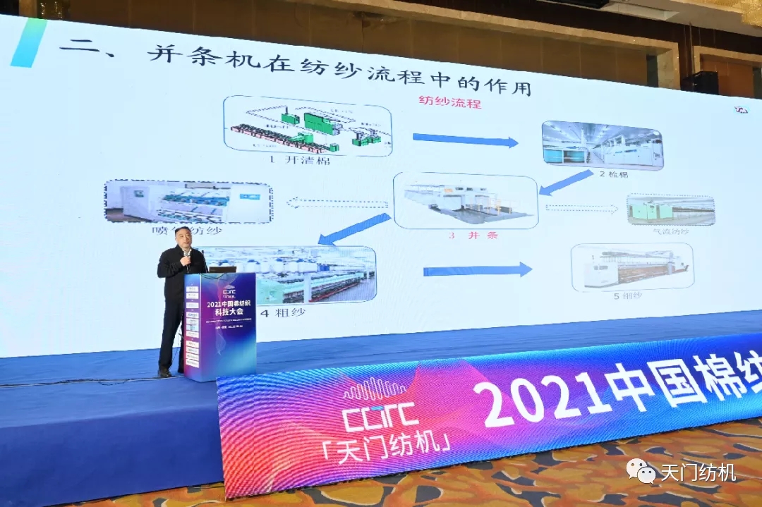 太阳成城集团总经理焦伦进作了《并条机的创新与未来》的专题报告。在报告中,焦伦进总经理介绍了并条机在纺纱流程中的作用,并就目前纺织企业对并条机创新的要求,从传动结构及精度、加压系统、牵伸装置、清洁系统、部件及提供设备的数字化、信息化、智能化水平等方面进行介绍。最后,焦伦进总经理指出未来并条机将向着梳并联合、并粗联、短流程一体机在技术上的突破方向发展。