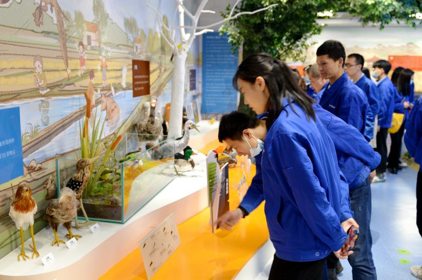 在公园管理员的导引下,我们拾级而上,参观了科普馆。这座科普馆是以张家湖历史、水文、生态为脉络,倾心打造的集生动、趣味于一体的现代视听平台,还原了农耕时代人类休养生息的原貌和花鸟鱼虫百态。走在曲曲折折的参观回廊上,感觉耳朵不够使,眼睛也不够用,太多的信息总是扑面而来。同事们都在感叹:真是不虚此行,既休闲、愉悦了身心,又学到了知识,收获满满。