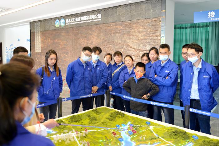 公司全体青年员工坐乘大巴车来到了张家湖国家湿地公园,它位于湖北省天门市九真镇,湖泊水域面积6.53平方公里,平均水深1.8米,是典型的浅水湖泊,其湿地类型属内陆淡水湖泊,是天门市最大的湖泊,也是湖北省保持原始生态最好的湖泊之一。到上世纪二十年代,随着湖区淤积、湖泊萎缩,西部形成张家湖,东部形成石家湖。到达目的地后,公园的工作人员进行了热情地接待,大家仿佛穿越到了原生态的农耕时代,湖泊密布,半岛罗列,河湖相通,一派水乡泽国、湖光田园景象。来到观鸟台,登高望远,一览张家湖美景和各种野生鸟类。公园设有科普馆,里面陈列了湿地的人文风貌及天门的特色文化,还有各种摄影大片。