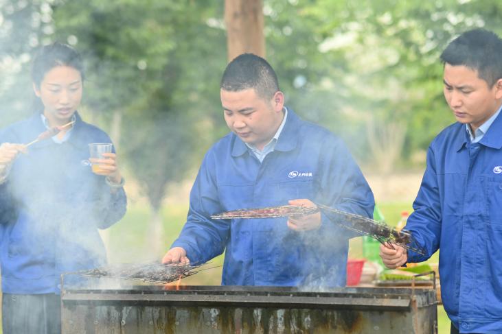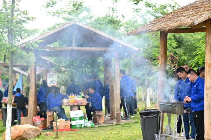 带着依依不舍的心情,青年员工们告别张家湖国家湿地公园,来到皂市长寿村原村。这是一座位于皂市镇境内的农家乐,田园气息浓烈,采摘和烧烤乐趣无穷,大家直奔烧烤专区。几名青年员工已提前将炊具、餐具和食材运送到目的地,大家不顾疲惫,开始分配工作,我是“支宾先生”,你是“炊事员”,她是“勤杂员”。一会儿后,炊烟升起,香气四溢,有烧烤和火锅的香辣味,有菠萝的香甜味,有主食的香糯味,更有青年朋友们团结协作的欢声笑语。
