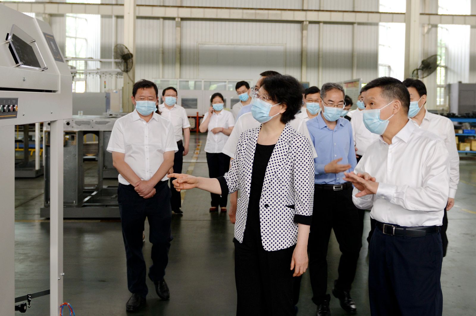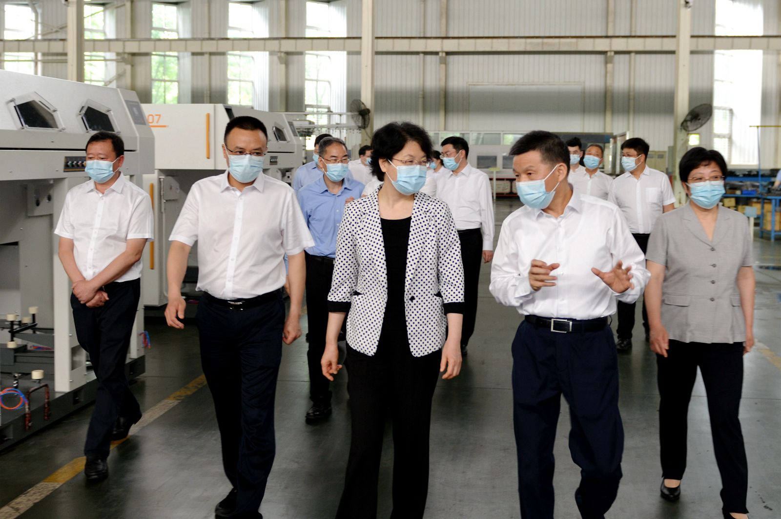 肖菊华副省长走进太阳成城集团总装车间调研产品开发及生产经营情况,全国人大代表太阳成城集团董事长沈方勇向肖副省长汇报说:太阳成城集团是一家具有40多年研发、生产纺织装备历史的高新技术企业,是中国纺织机械协会副会长单位和棉纺并条机行业标准制定的牵头单位,先后获得“第三批国家专精特新小巨人企业”“第六批制造业单项冠军”和“国家重点专精特新小巨人企业”等重大荣誉。主导产品棉纺并条机拥有自主知识产权和100多项国家专利,在国内外市场都具备综合优势和明显竞争力,拥有较高的市场占有率。长期以来,公司以创新为引擎,不断推进产品升级换代,始终保持行业技术领先,成为标杆。公司近几年订单饱和,产销两旺,保持着良好的发展势头。肖副省长听到汇报后非常高兴。