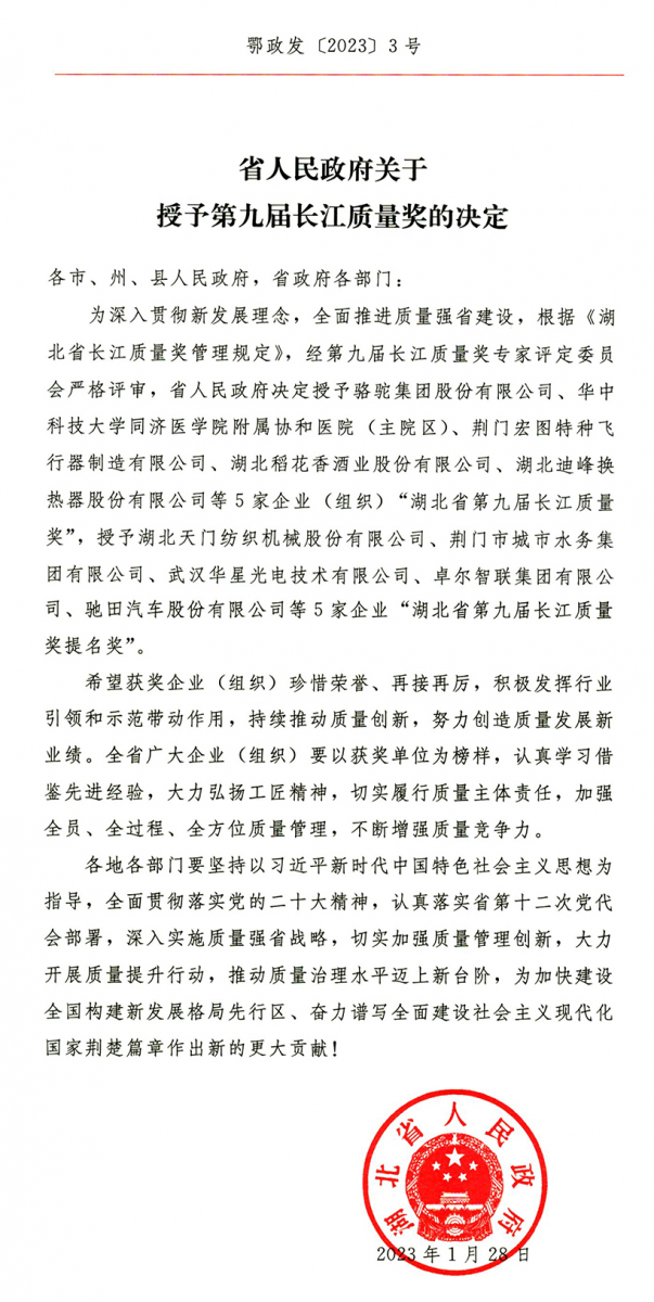 “长江质量奖”是经中央同意,湖北省人民政府设立的省长质量奖,是湖北省最高质量荣誉奖项,旨在推进全省企业或组织实施卓越绩效管理模式,推动质量强省战略深入实施,促进湖北经济社会高质量发展。该奖项分为“湖北省人民政府长江质量奖”和“湖北省人民政府长江质量奖提名奖”两个级别,每个级别不超过5家企业(组织),可谓是百里挑一、优中选优。