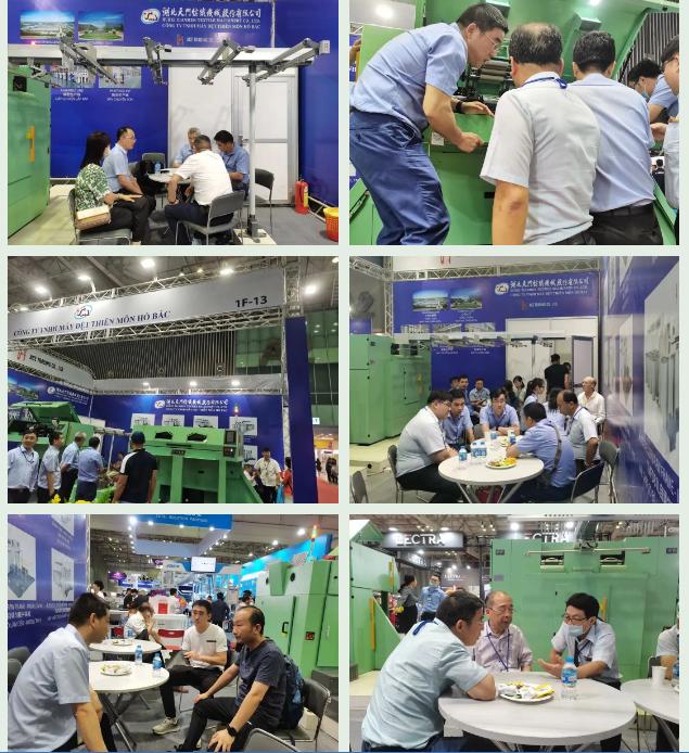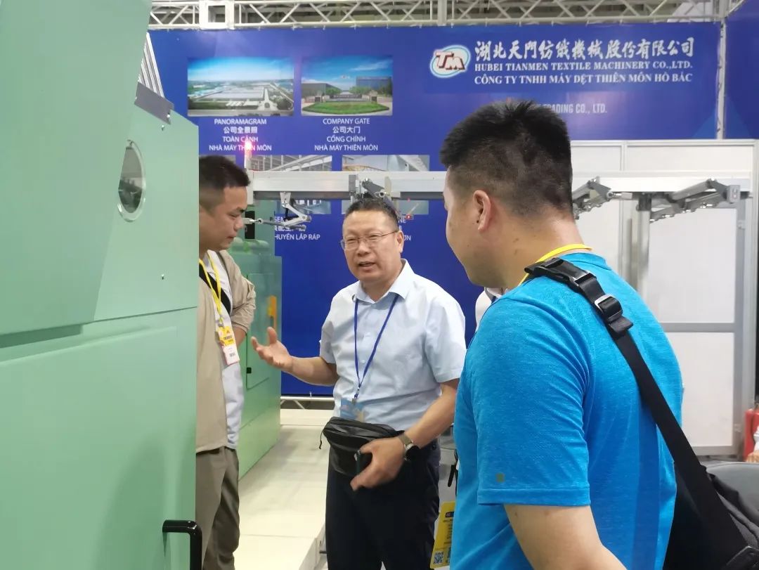 4月7日是展会的第三天,我司展位依然人流如织、门庭若市。越南Phung Hung纺织、Phu Bai国家纺织集团、Hoa Tho纺织、太子龙纺织、天虹纺织等企业人士和专家观摩了我司并条机。