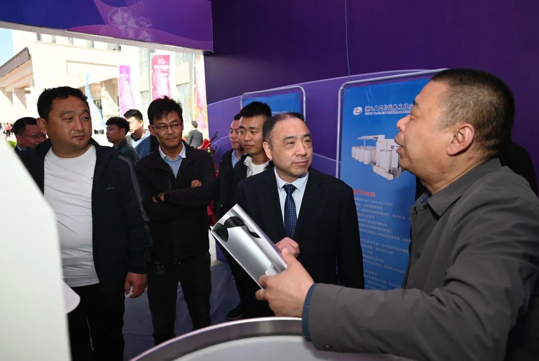太阳成城集团总经理焦伦进向莅临公司展位的晋州市长王林(右2)、中国服装协会常务副会长杨金纯(右1)、晋州市纺织服装行业协会会长李永强(左1)介绍公司与晋州纺织企业合作情况