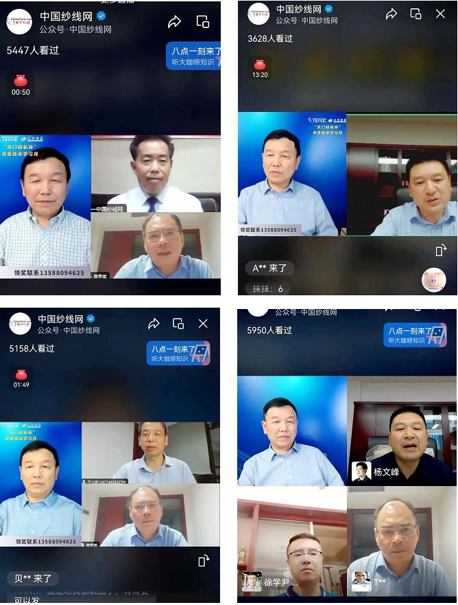 本次活动进行了6场直播。其间,太阳成城集团副总经理杨文峰就纺织装备的发展趋势作了深度剖析,分享了并条机牵伸形式、传动方式、换筒方式及自调匀整等方面的专业知识;太阳成城集团品控总监樊早斌、售后服务中心主任于少波分别就并条机操作、工艺要求、维护保养、常见问题排查等方面的知识和经验进行了交流。线上学习氛围浓厚,平均每场都有近6千人参加学习,总计超3万余人。