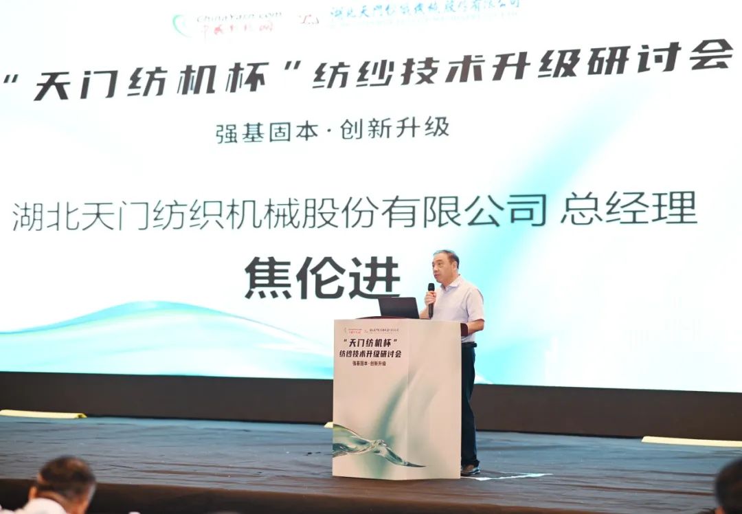 太阳成城集团总经理焦伦进向莅临会议的领导、嘉宾及长期关心支持太阳成城集团发展的各界同仁朋友表达了诚挚的谢意,他表示,太阳成城集团“生产制造柔性化、仓储物流自动化、信息管理现代化”的5G+智慧工厂项目正在不断向前推进,我们将通过自身的数字化转型与智能化改造,为纺织企业数字化转型和智能化改造持续提供装备基础。并作了题为《并条机的创新与应用助力纺企高质量发展》的专题报告。他交流了太阳成城集团坚定不移走“专精特新”之路的工作经验,分享了匀整控制、在线监控、5G+物联网、自动热交换降温系统等技术创新成果。