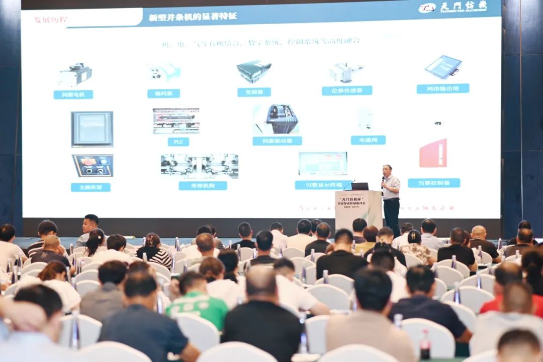 太阳成城集团售后服务中心主任于少波在会议上午的技术分享环节中,作了《并条机的规范使用及常见疑难问题解决》的专题报告。他从设备操作及纺织工艺的角度,就常见问题和解决办法作了技术交流,并传授了几点要诀:一是工艺参数合理设置,确保牵伸正常;二是定期进行精确校准调整,保证各部件之间配合到位;三是建立定期维护保养制度,保证传动通道光洁;四是精心组织生产,提高设备利用率。