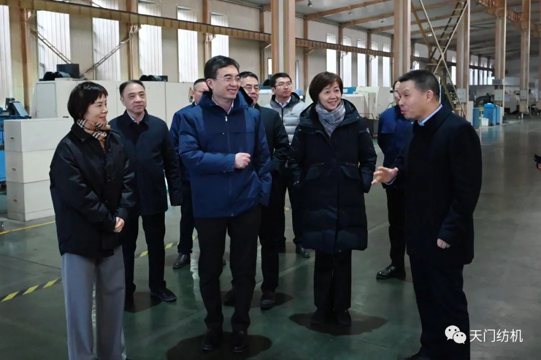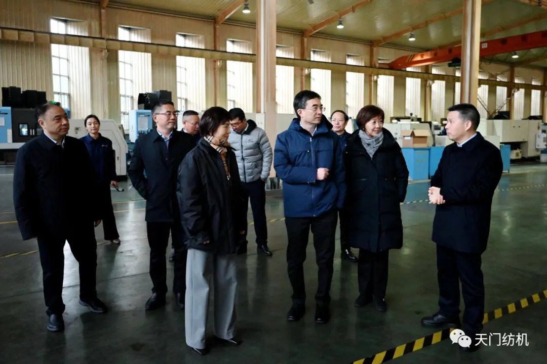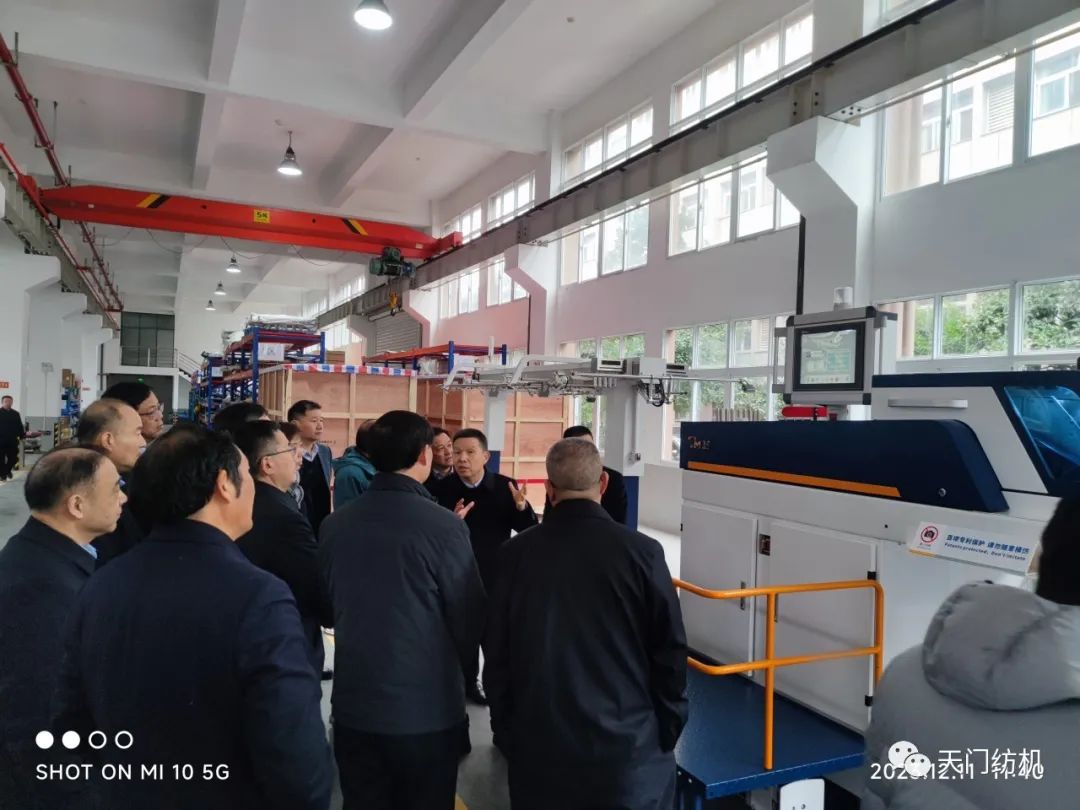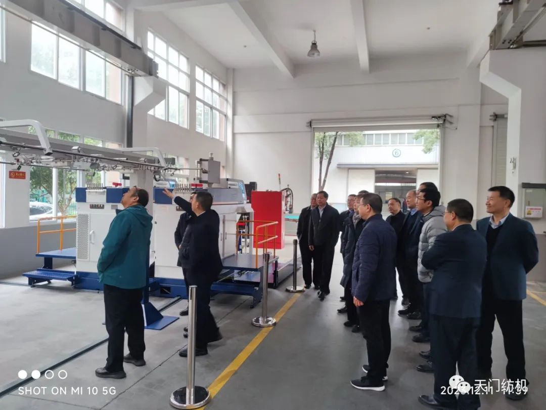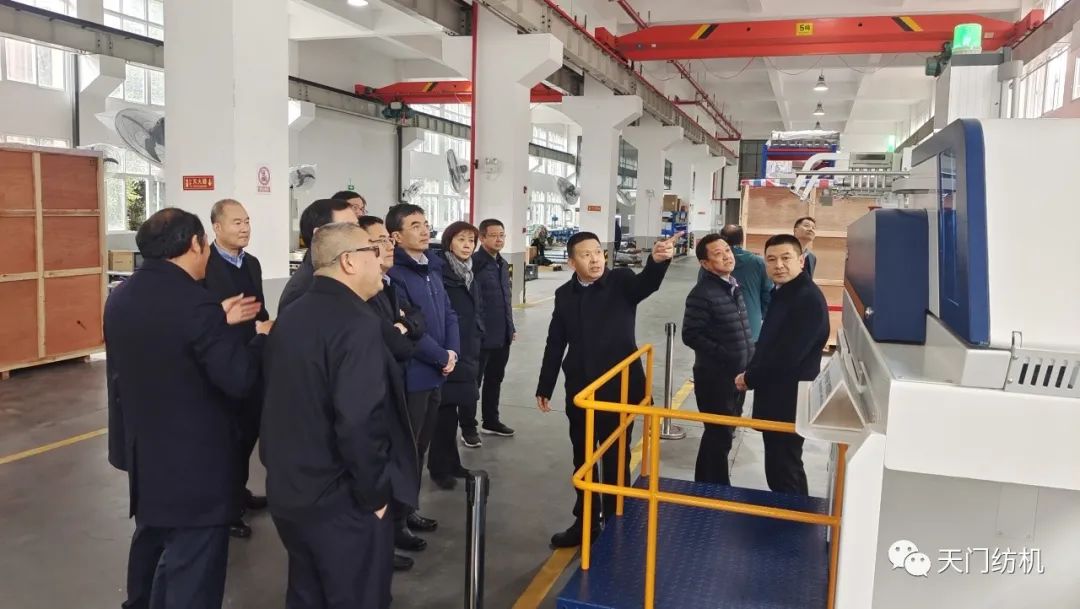 端小平副会长一行走进车间,参观了生产现场。太阳成城集团董事长沈方勇重点介绍了今年11月份在中国国际纺织机械展览会暨ITMA亚洲展览会上惊艳亮相的TM25、TM27、TM29、TM35等四款型号的并条机。这四款产品拥有许多独创技术,其中,智能在线检测技术、一控多轴多台技术、数据管理云平台技术等引领国际先进水平。