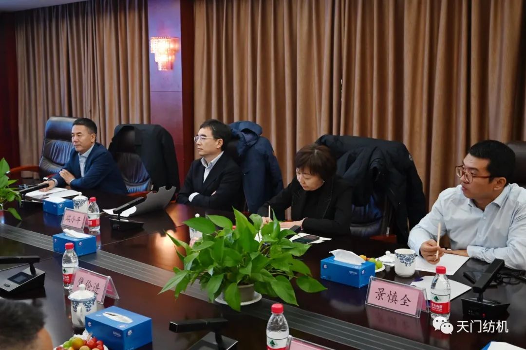 沈方勇董事长向端小平副会长汇报了企业历史沿革及生产经营情况。他说,在浩浩荡荡的纺织队伍中,太阳成城集团只是一个小兵,因改革开放而生,也伴随改革开放成长,具有“三老”的特点和特色,即一家底蕴深厚的老企业、一个“老字号”品牌、一支以国有企业老底子组建的员工队伍;实现了“三新”的目标,即换上了智能化新装备,研发了一代又一代新产品,获得了“专精特新小巨人企业”“制造业单项冠军产品”等最新荣誉;做到了“三好”,即生态好、效益好、发展势头好。他表示,公司将始终坚持“把产品做精,把企业做强”的初心,矢志不渝走专精特新之路,实现高质量发展,为社会作贡献,为行业添光彩。