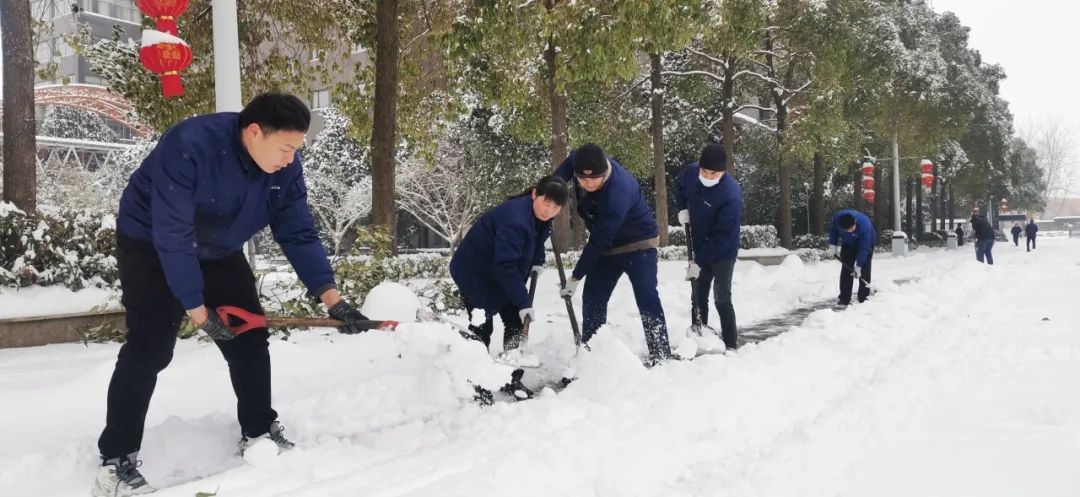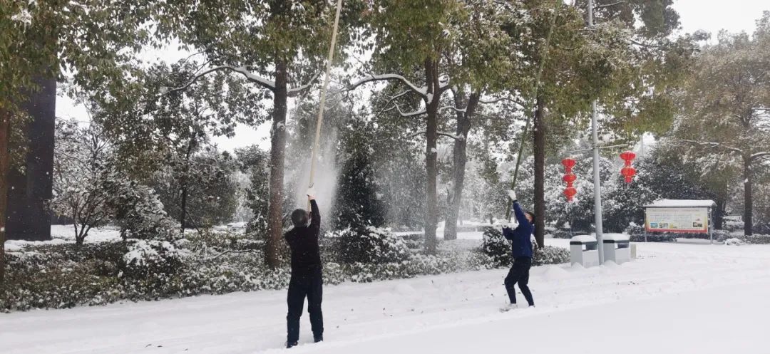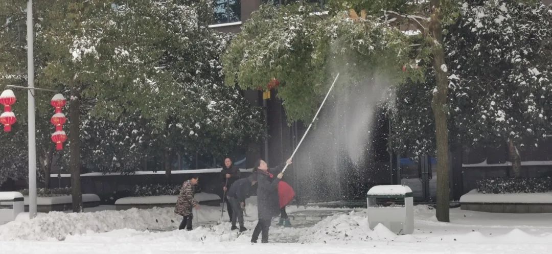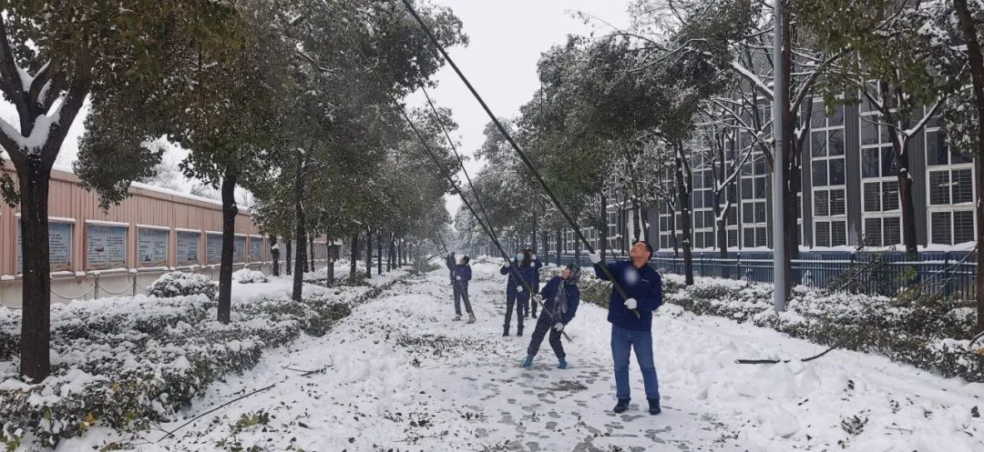 清晨的气温在零下4度左右,寒意刺骨。但大家不惧严寒,手握铁锹,高举竹竿,竭尽全力清除积雪。