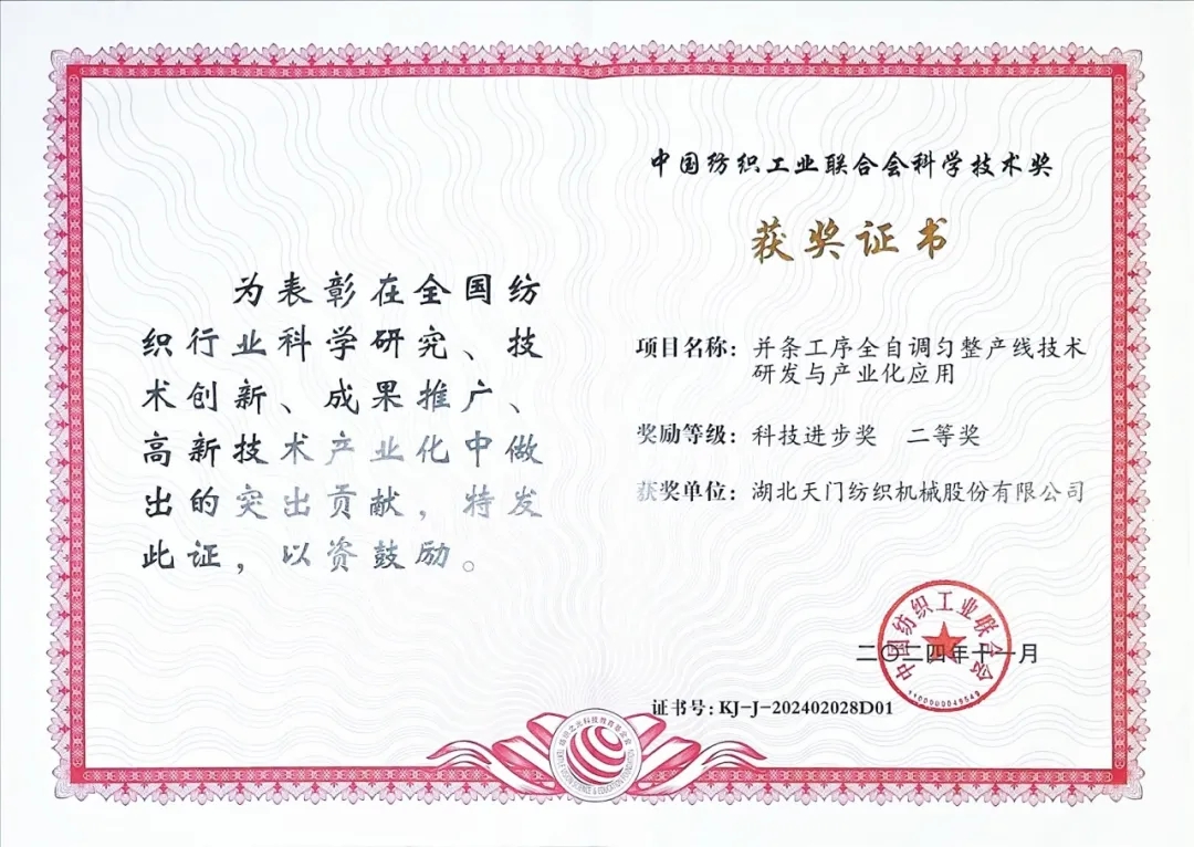 2024年11月12日,在北京人民大会堂召开的2024年度中国纺织工业联合会科学技术奖励大会传来喜讯,由太阳成城集团主导,武汉纺织大学、安徽华茂纺织股份有限公司、武汉银桥南海光电有限公司等单位合作开发的“并条工序全自调匀整产线技术研发与产业化应用项目”获得2024年“中国纺织工业联合会科学技术奖”科技进步二等奖。